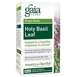 Dietary SupplementSingle HerbsSupports a healthy response to stress*Promotes a healthy inflammatory response with Eugenols: 17mg* Dual extracted Holy Basil leaf - Nourishes emotional well-being*Meetyourherbs60 Vegetarian Liquid Phyto-CapsSingle HerbsIndividual herbs in their brand, natural form support each person uniquely. Gaia Herbs' single Herbs contain concentrated extracts of an individual medicinal herb, to deliver nature's vitality to you.Holy Basil LeafHoly Basil supports a healthy response to stress, while nourishing the mind and elevating the spirit.* Gaia Herbs uses dual extraction technology to deliver the broadest spectrum of herbal constituents: Supercritical CO2 extraction, for fat-soluble constituents such as Eugenol, and water and alcohol extraction, for water-soluble constituents like Rosmarinic Acid.The Gaia DifferenceHigh potency, easy absorption - Alcohol-free Liquid Phyto-Caps U.S. Patent No. 6238696 B1 100% vegetarian, dairy free, no gluten-containing ingredients - Easily digestible plant-derived capsule Laboratory tested for purity - Free of heavy-metal toxicityGaia Farm - Brevard, NCOver 40 crops are grown each year on our certified organic farm. 250 fragrant acres of Valerian, Echinacea, Holy Basil, Hawthorn, Nettles, and more grace our valley. Each plant thrives naturally here, in one of the most fertile bioregions in the world.Each 2 capsules contains 3000 mg crude herb equivalent.*This statement has not been evaluated by the Food and Drug Administration. This product is not intended to diagnose, treat, cure or prevent any disease.